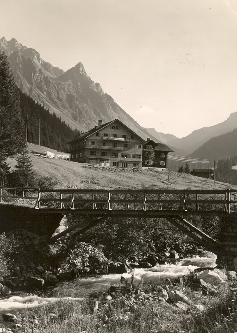 1933 – Wo alles beginnt – Das Asthma brachte den jungen Elektriker Eduard Bachmann in den Luftkurort Gargellen, wo er Reinhilde kennen und lieben lernte. Gemeinsam bauten sie ein einfaches Holzhaus mit 25 Betten – die Pension Bachmann. Zwanzig Jahre später erfolgte der erste große Anbau.