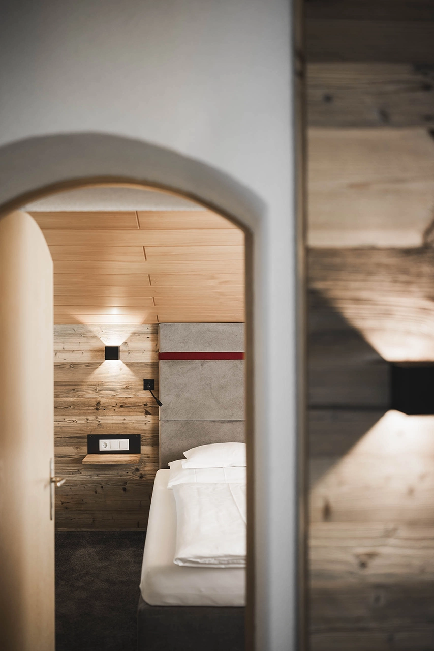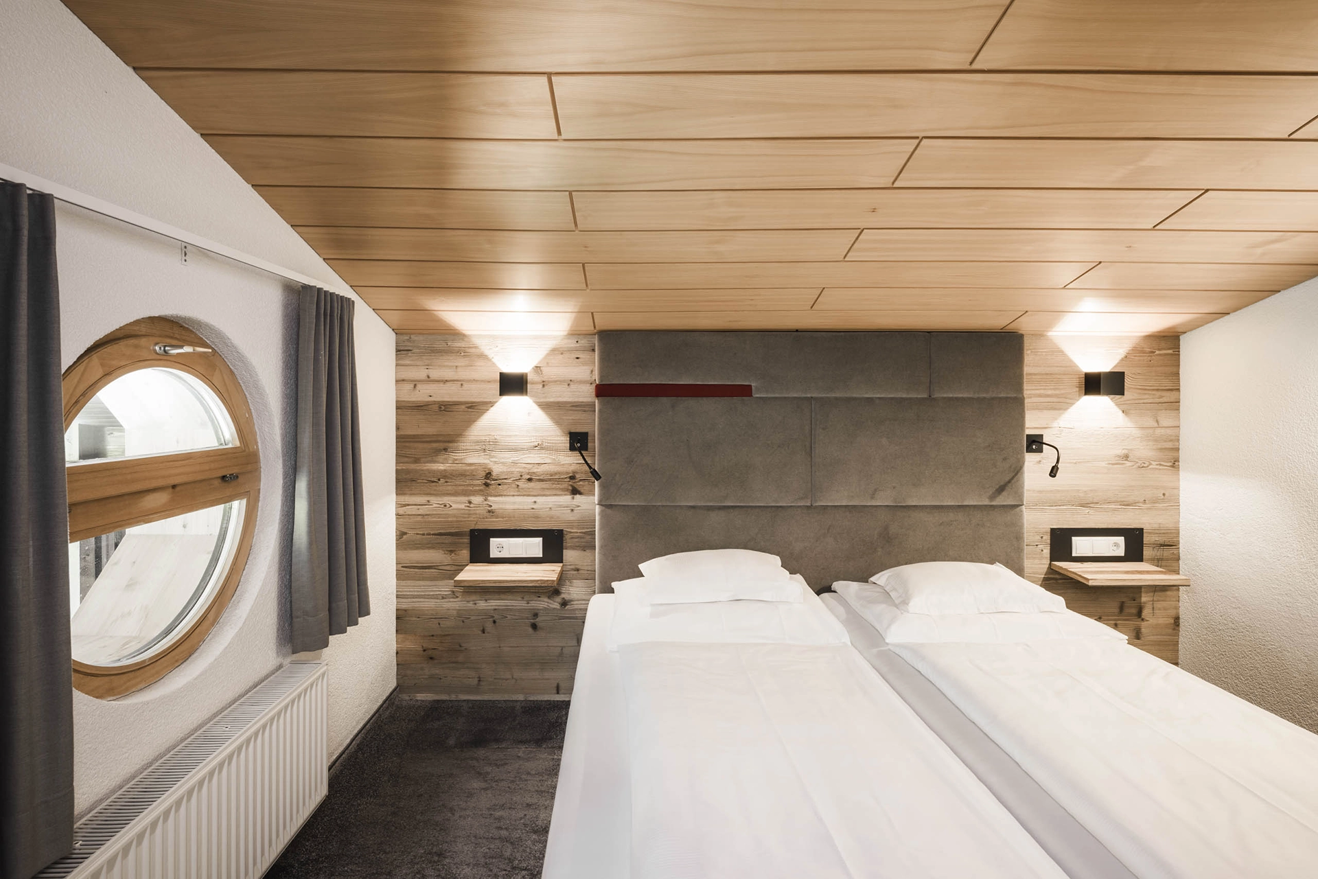 Eine „himmlische“ Suite – im wahrsten Sinne des Wortes: mit gemütlicher Holzdecke und Dachschräge. Zwei getrennte Schlafzimmer mit Kingsize-Doppelbetten und ein Sitzbereich bieten jede Menge Platz für die ganze Familie. Ein stimmiges Lichtkonzept, warmes Altholz und sanfte Farbakzente bilden den perfekten Rahmen für eine erholsame Auszeit in den Bergen. Die Röbi-Suite ist ein liebevoll konzipiertes Unikat mit großformatigen Landschaftsfotografien und ausgewählte Accessoires. Der Blick vom Balkon reicht bis zur Alpe Röbi und auf naturbelassene Wälder. Im großzügigen Bad sorgen edler Naturstein und eine Walk-in-Regendusche für pures Wohlbefinden.