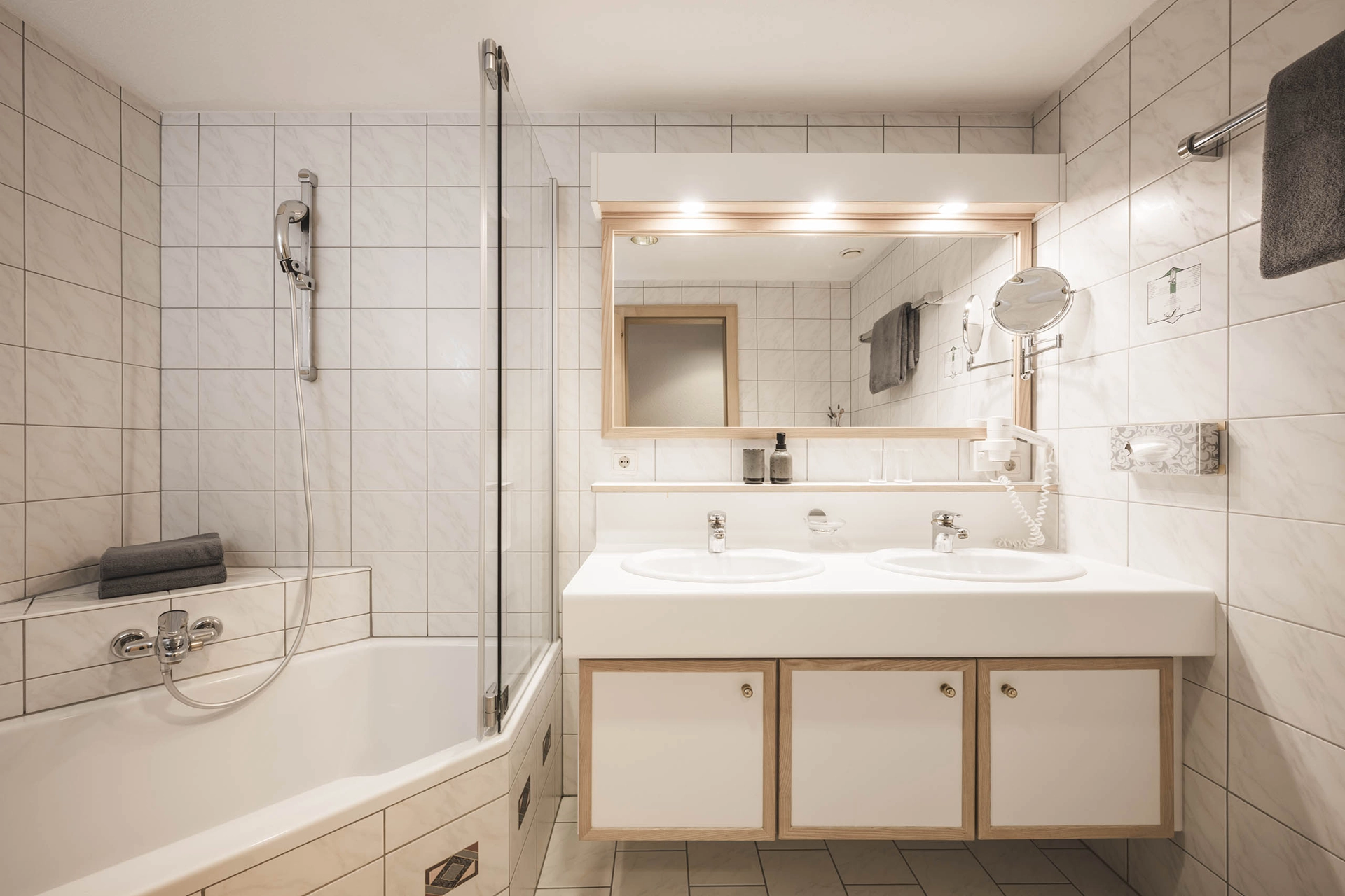 Diese Suite haben wir nach der wunderschönen Alpe Rongg benannt, die du vom Balkon – und sogar vom himmlischen Kingsize-Bett aus – sehen kannst. Wie wär’s mit einer Eckbadewanne für entspannte Momente? Selbstverständlich! Und duftende Alpenkräuter-Kosmetikprodukte aus Vorarlberg, ein Kosmetikspiegel sowie flauschige Handtücher und Bademäntel für wohltuende Momente.