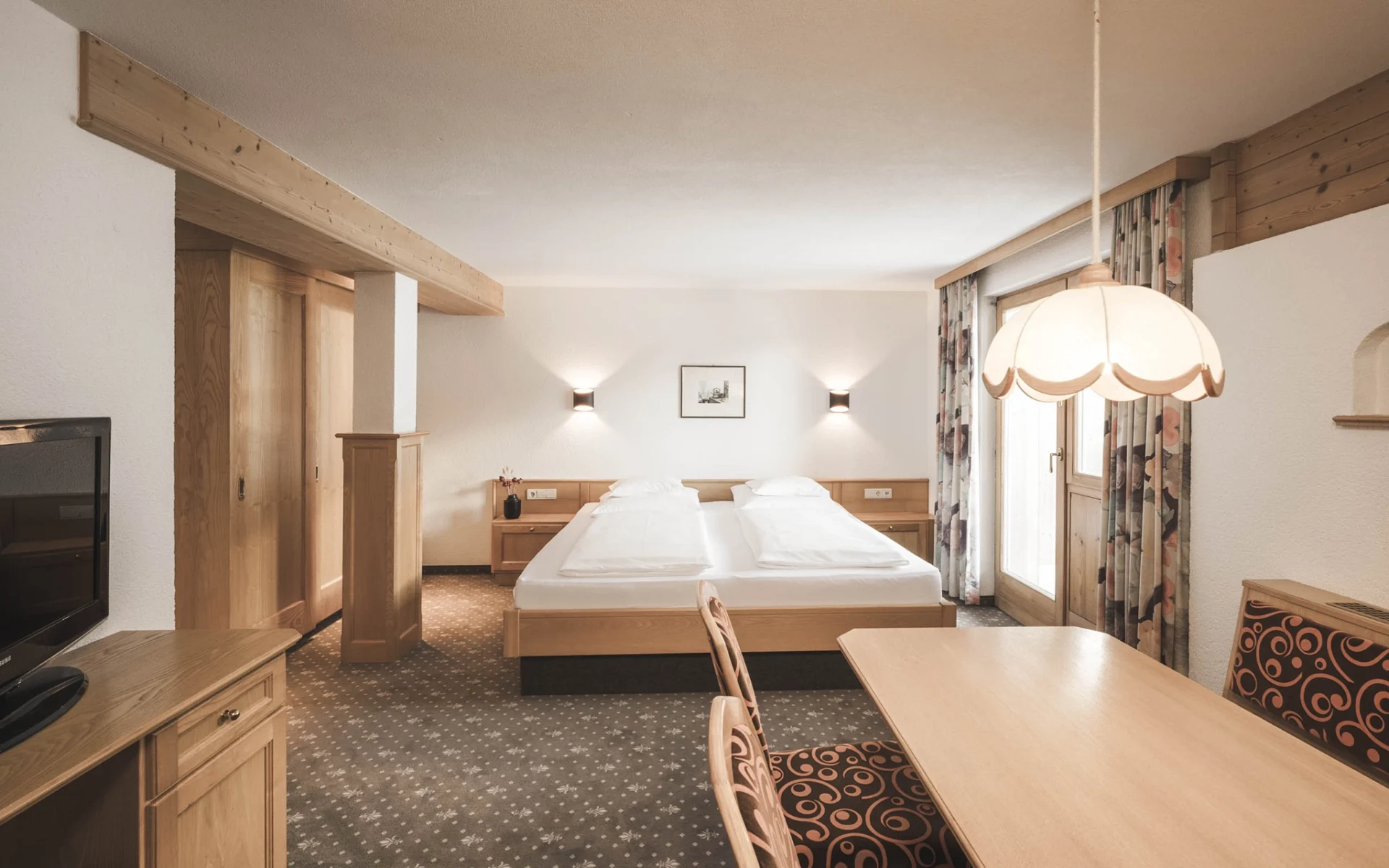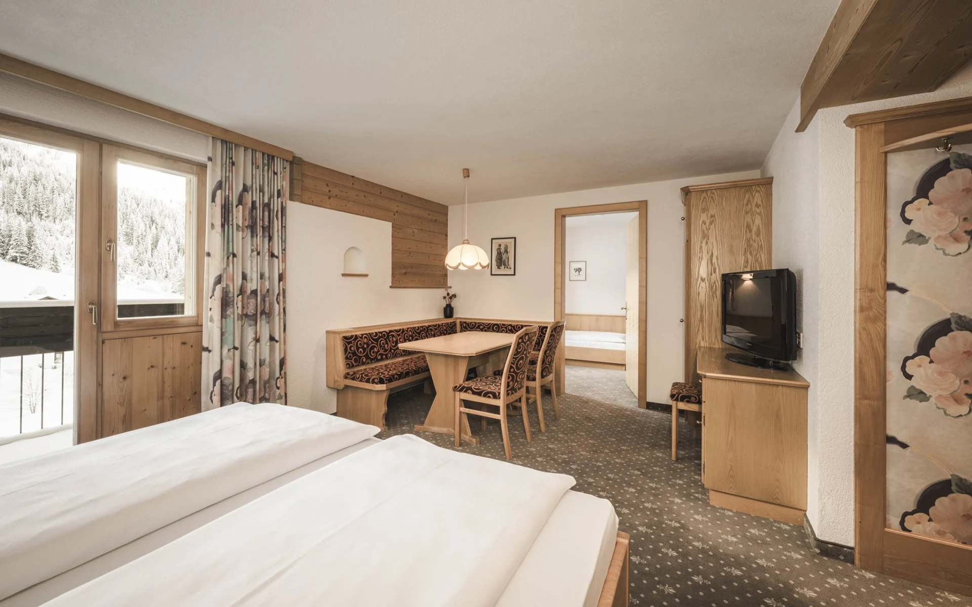 Mehr Licht, mehr Luft, mehr Freiheit – für die ganze Familie: mit zwei getrennten Schlafzimmern und einem großzügigen Sitzbereich. Vom Balkon blickst du auf sattgrüne Wälder und die wunderschöne Alpe Rongg.