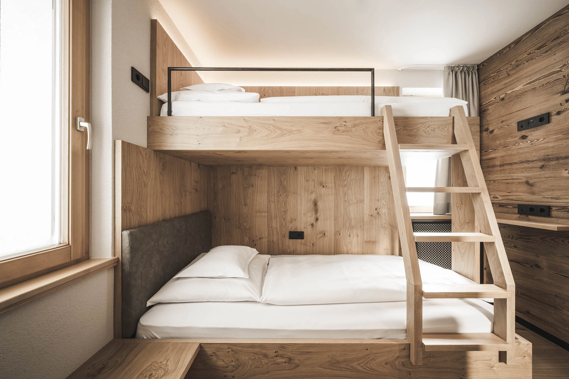Eine Hommage an die Wunder der Natur: warmes Altholz, Filz und Eichenholzfußböden. Und das Beste: getrennte Schlafzimmer. Während die Kinder im gemütlichen Etagenbett jauchzen, genießt du die Ruhe und den Ausblick auf die archaische Madrisa.